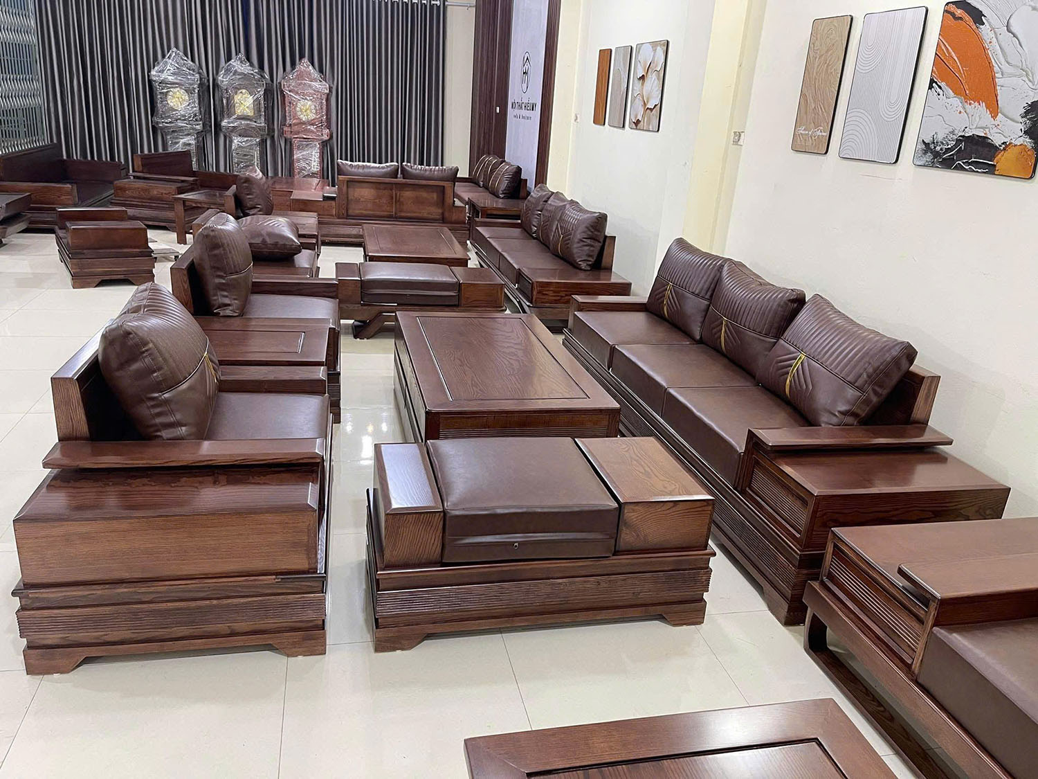 Bộ bàn ghế sofa gỗ tự nhiên kiểu dáng pháo màu óc chó