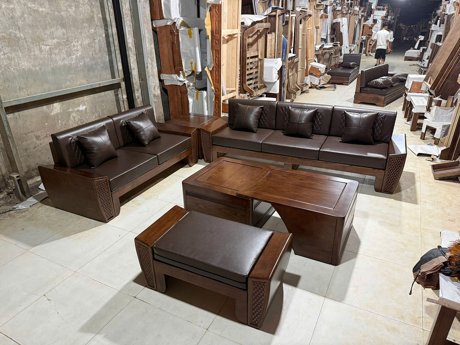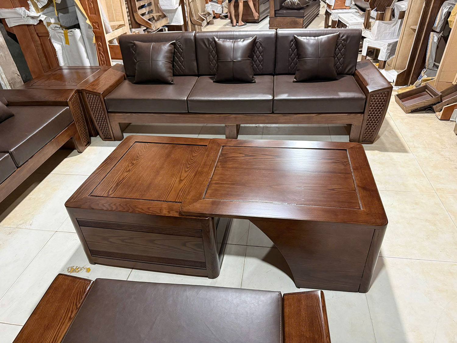Bộ bàn ghế gỗ phòng khách gỗ sồi màu óc chó 2 văng