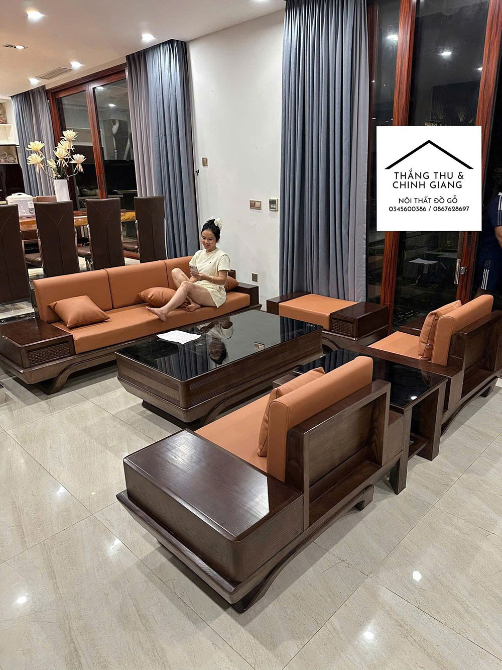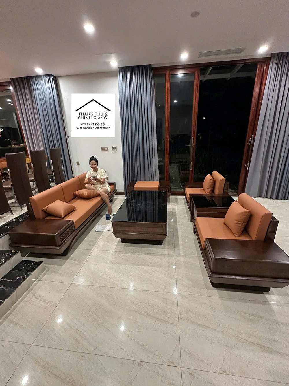 Bộ bàn ghế sofa gỗ tự nhiên kiểu dáng pháo màu óc chó