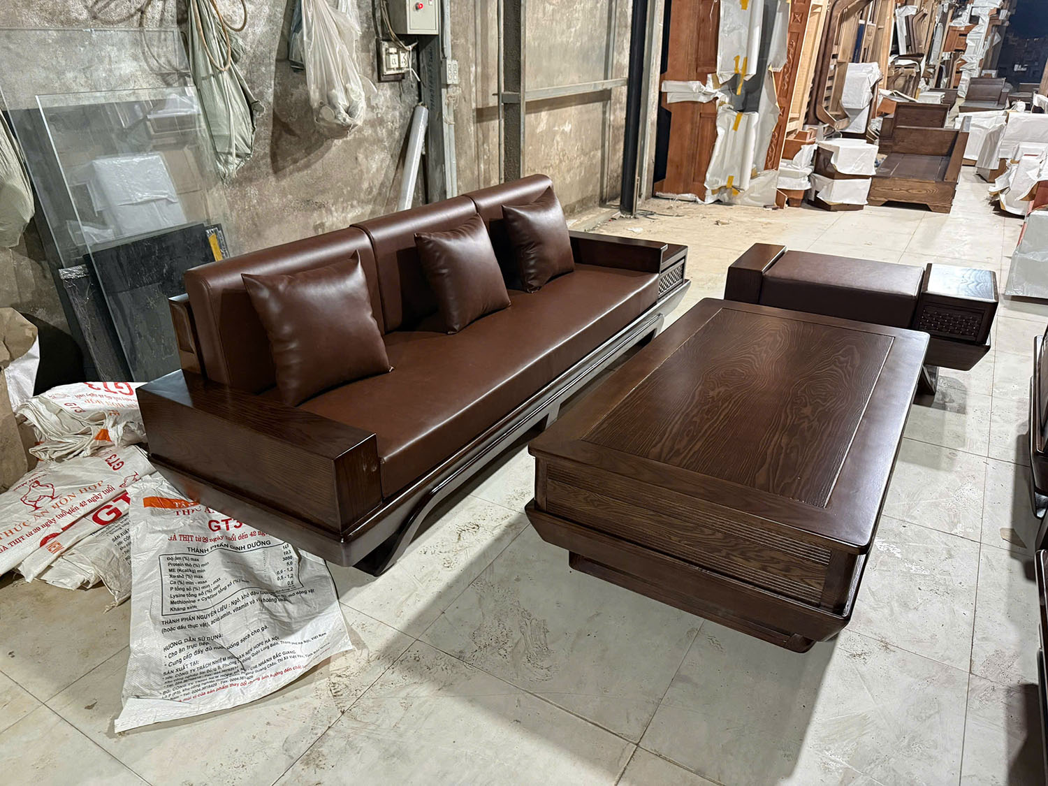 Bộ bàn ghế sofa văng cho diện tích phòng khách nhỏ gỗ sồi lau màu óc chó
