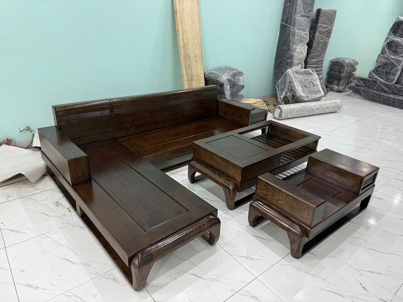 Với mức giá này, khách hàng đã sở hữu đầy đủ bộ sa lông gỗ gồm ghế chữ L, bàn trà và đôn ngồi. Đây là lựa chọn kinh tế nhưng vẫn đảm bảo chất lượng và thẩm mỹ cho không gian phòng khách.