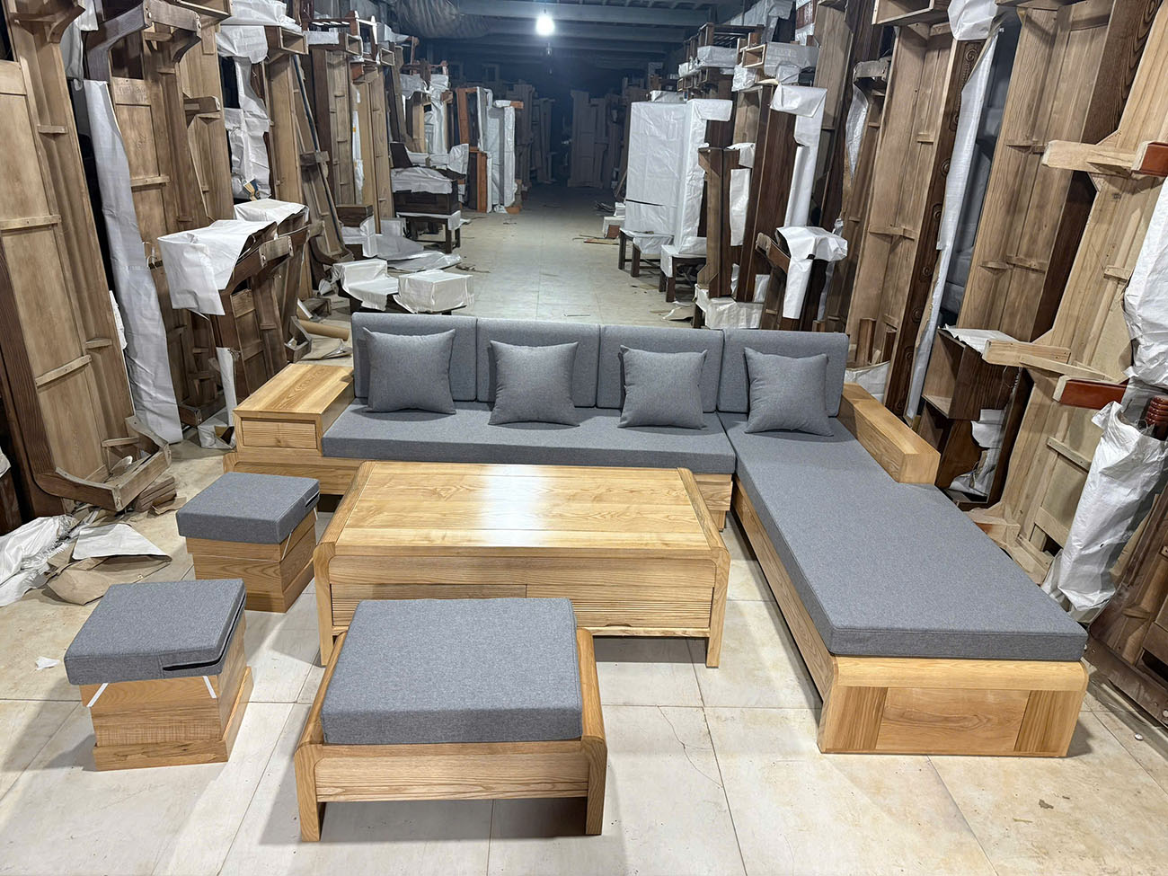 Sofa Gỗ Sồi Nga Chân Cuốn Chữ L – Bộ Bàn Ghế Phòng Khách Hiện Đại